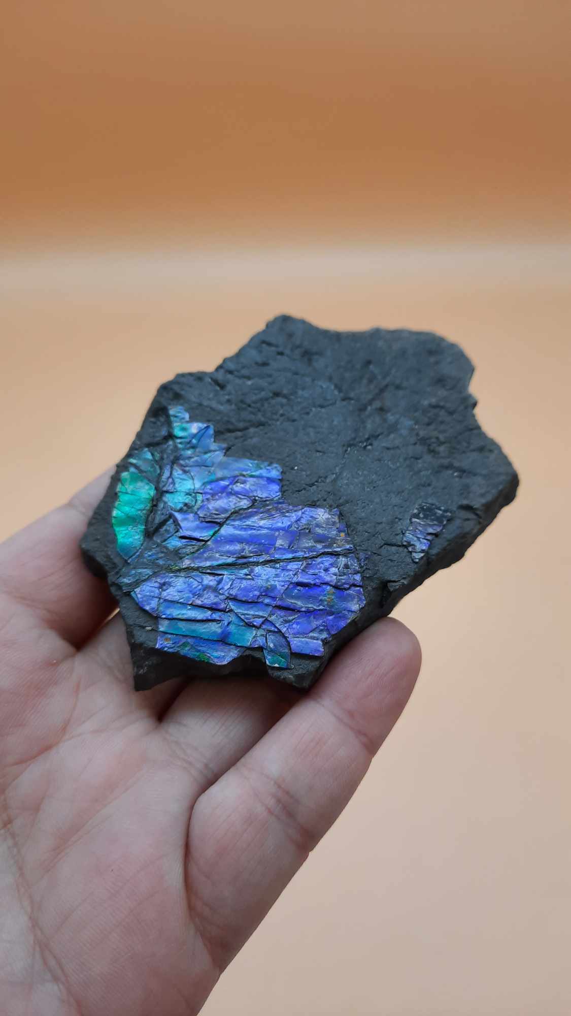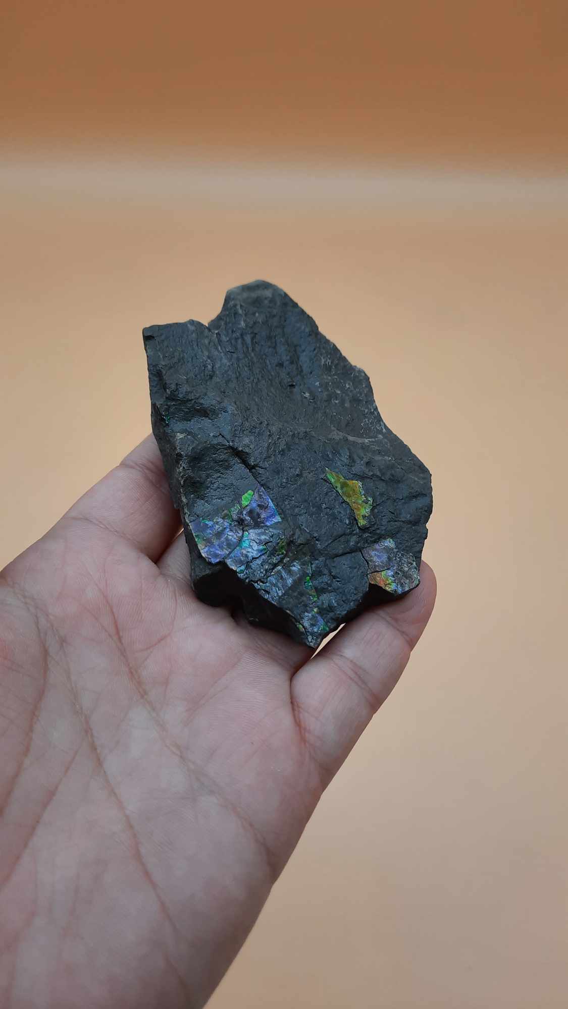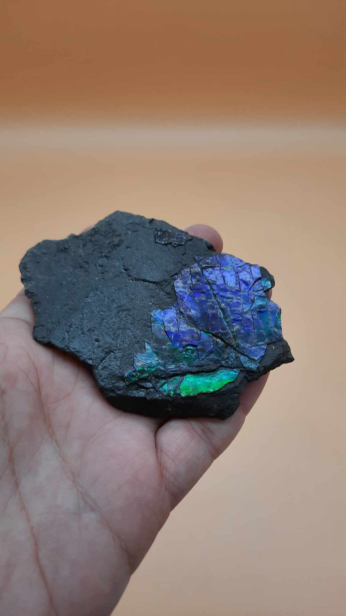 Jolie petit morceau d’ammolite brut aux reflets de bleu, de vert et de violet. L’ammolite est formé à partir de la nacre fossilisée d’une ammonite.