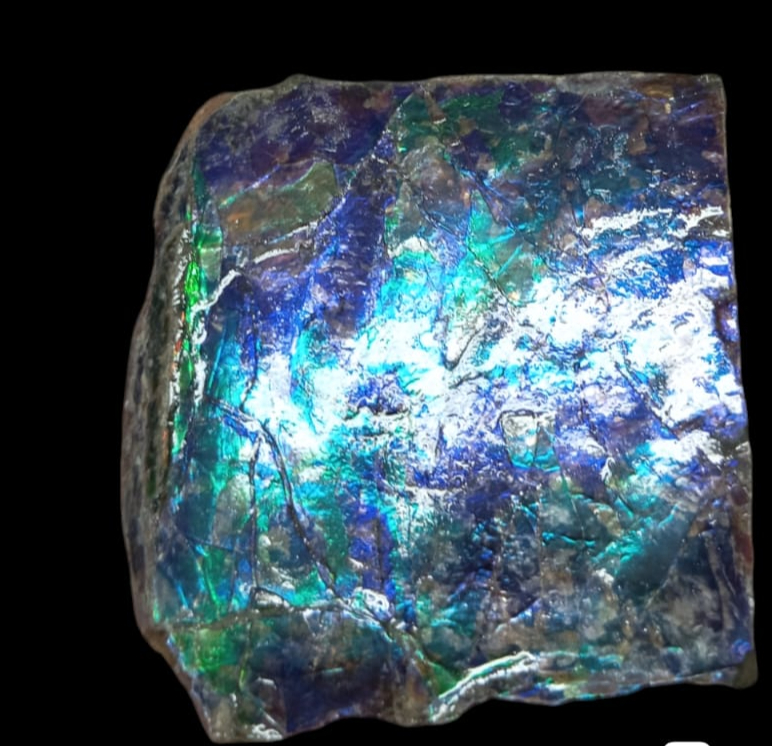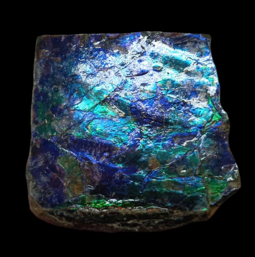 Jolie petit morceau d’ammolite brut aux reflets de bleu, de vert et de violet. L’ammolite est formé à partir de la nacre fossilisée d’une ammonite.