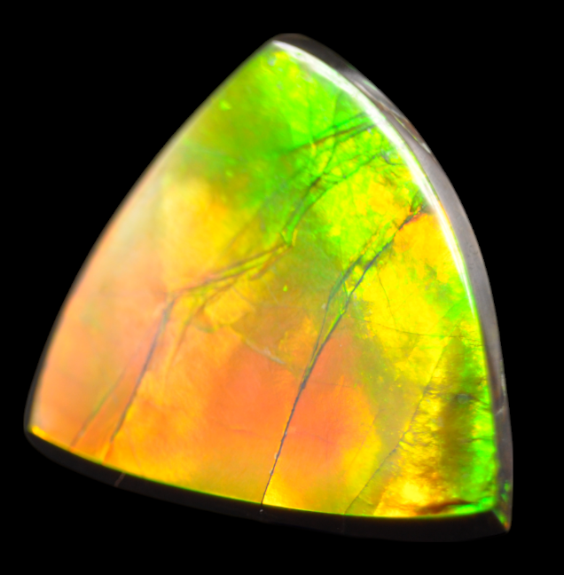 Morceau d’ammolite taillé prêt à être monté en bijou. Cette pierre semi-precieuse formée par la fossilisation de la nacre d’ammonite peut être considérée comme une gemme, avec des couleurs ici allant du vert au orange.