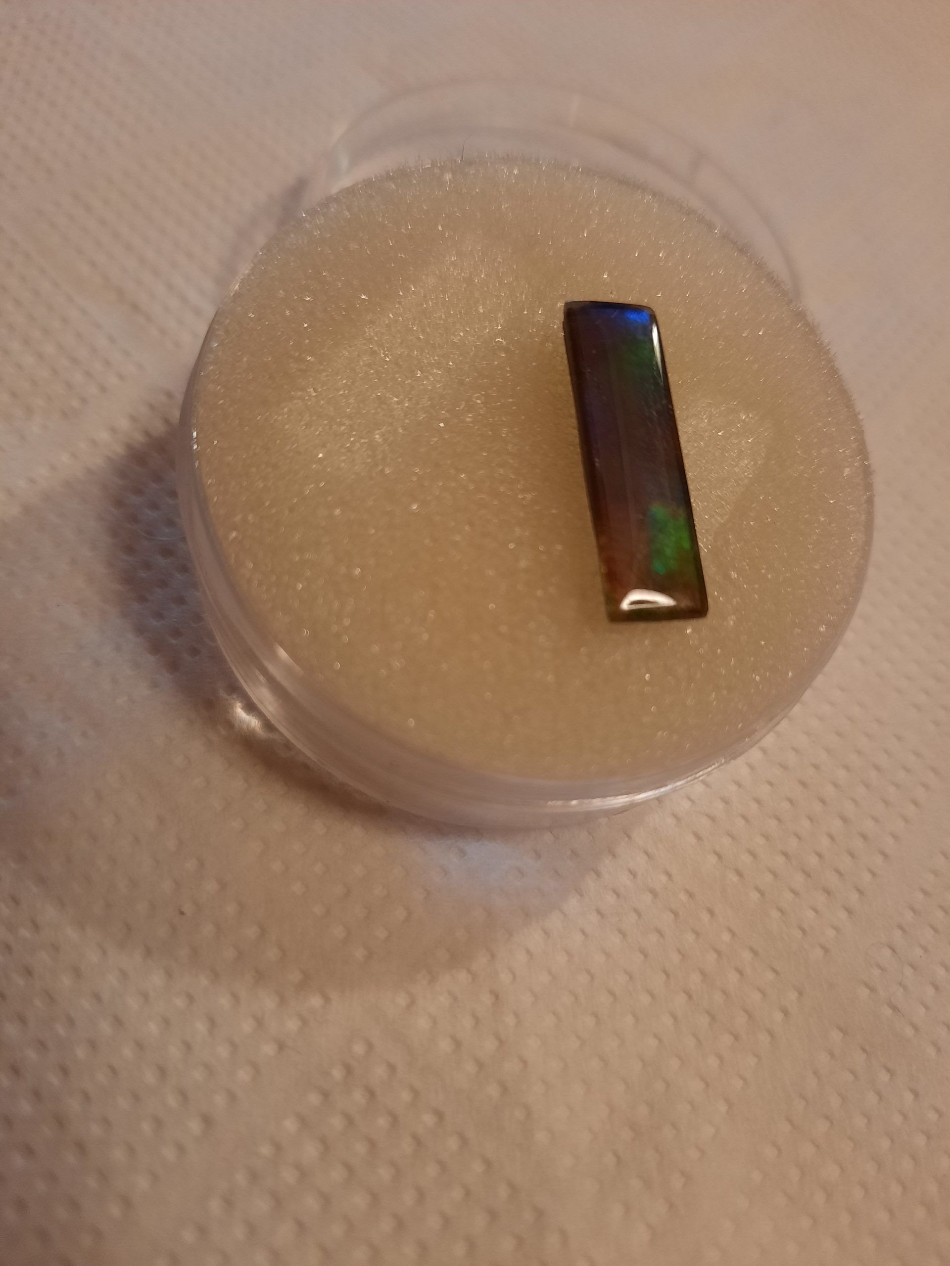 Morceau d’ammolite taillé prêt à être monté en bijou. Cette pierre semi-precieuse formée par la fossilisation de la nacre d’ammonite peut être considérée comme une gemme, avec des couleurs ici allant du bleu turquoise au rouge, en passant par le jaune, le vert, le bleu foncé, et le violet.