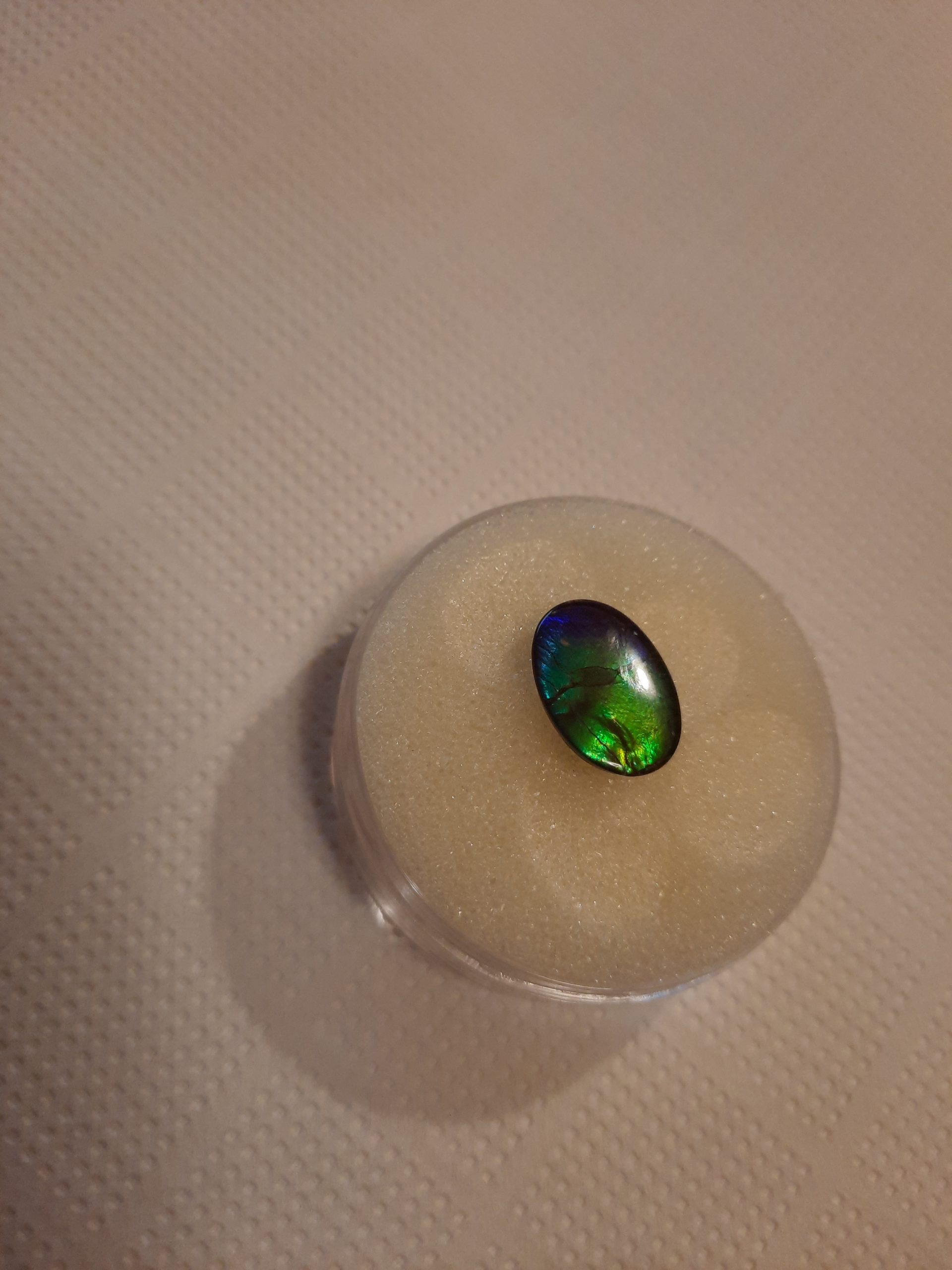 Morceau d’ammolite taillé prêt à être monté en bijou. Cette pierre semi-precieuse formée par la fossilisation de la nacre d’ammonite peut être considérée comme une gemme, avec des couleurs ici allant du bleu au vert en passant par le doré.