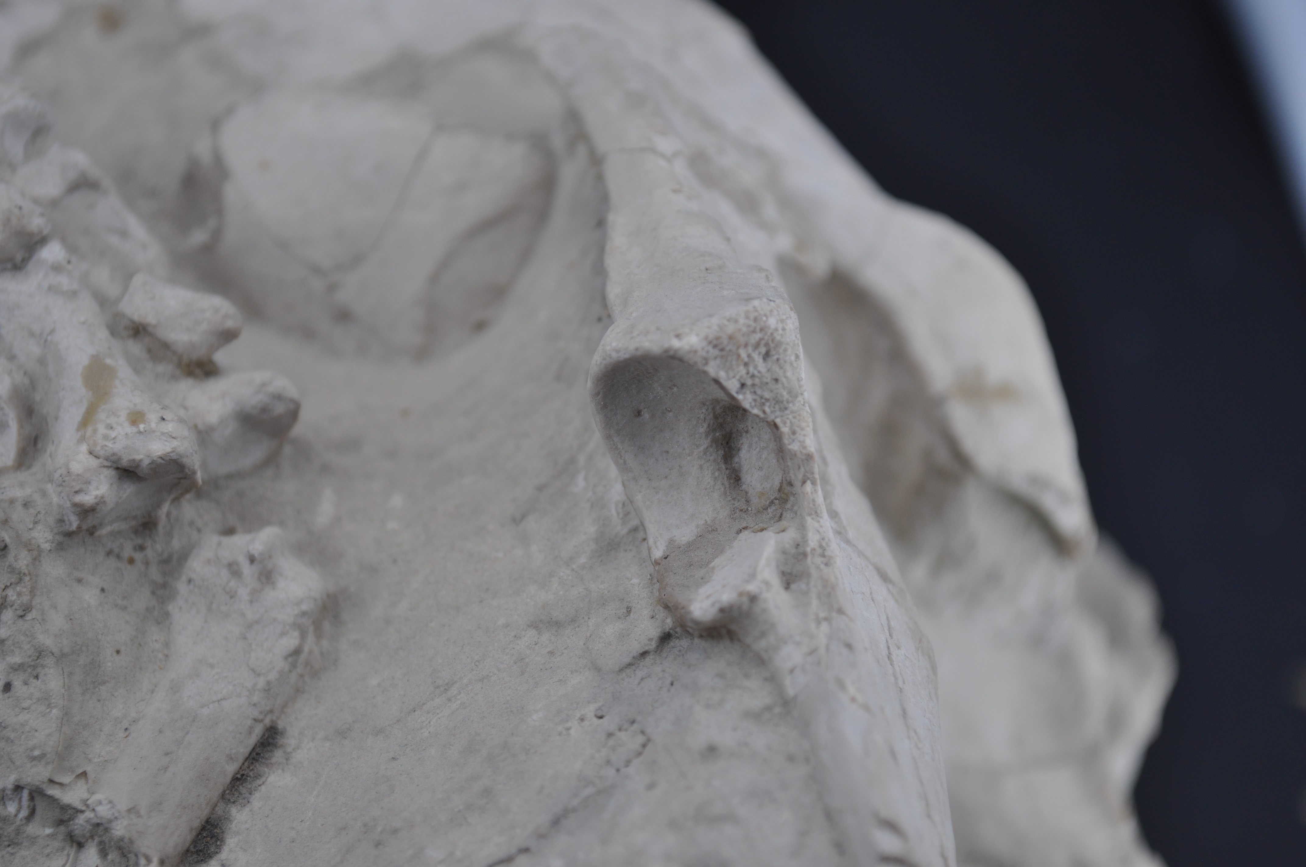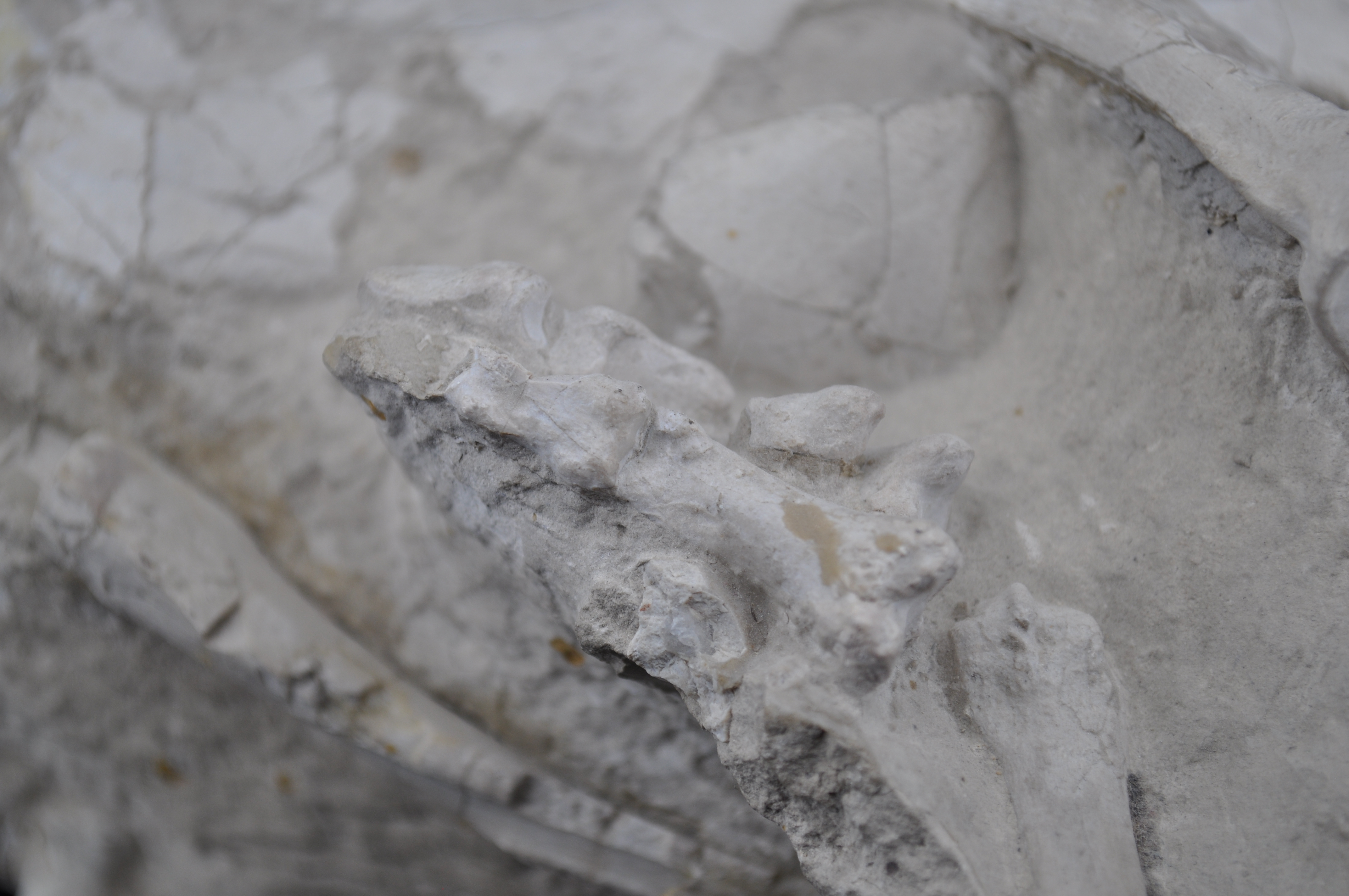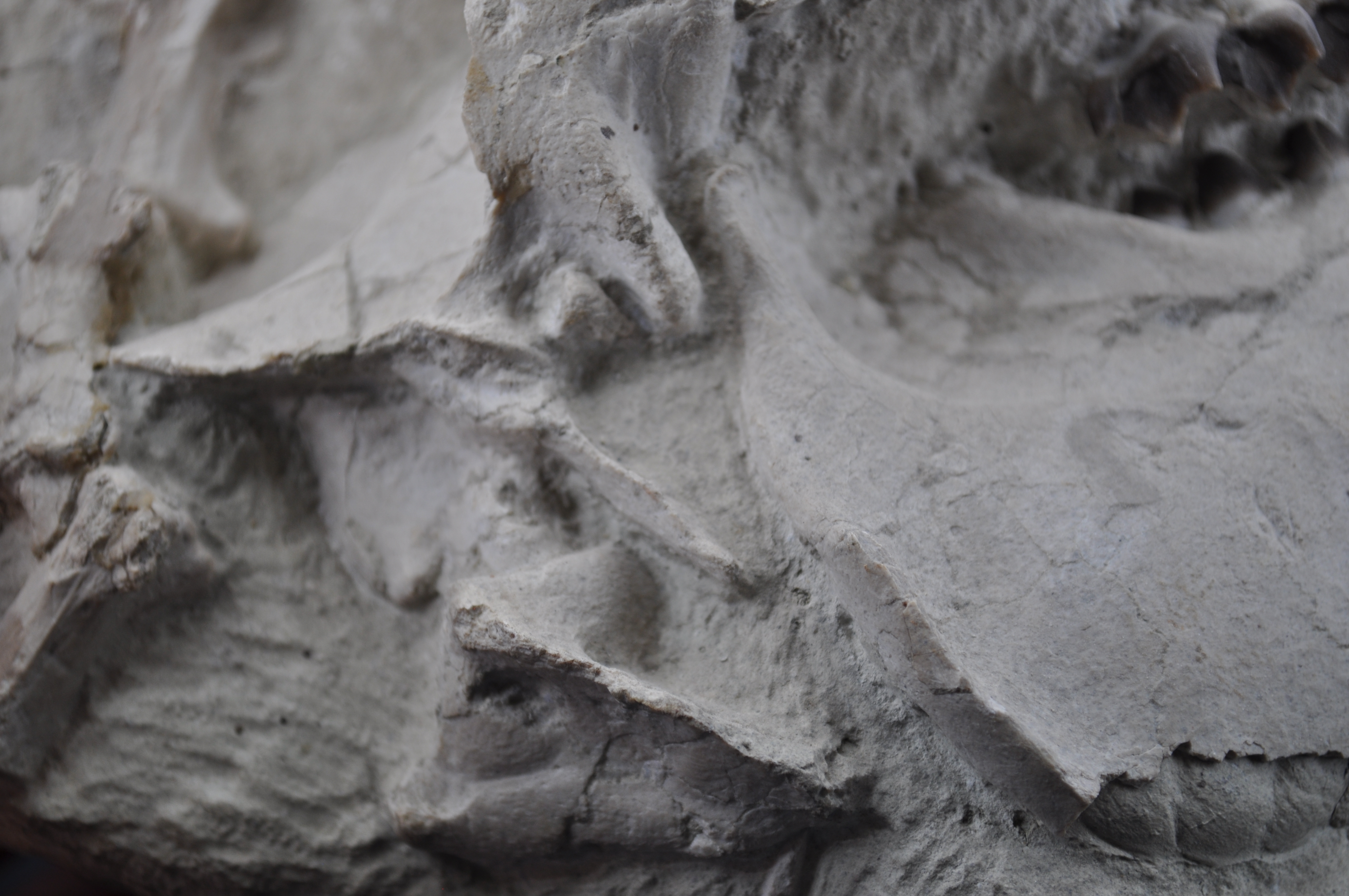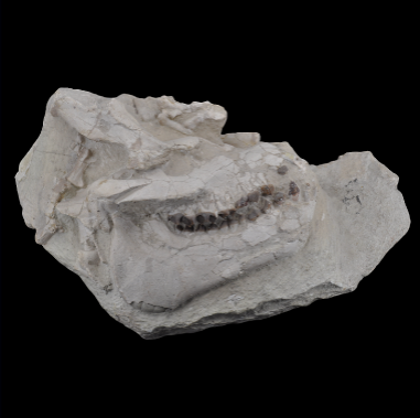 Crâne dans sa matrice de Merycoidodon culbertsoni. On y devine l’ensemble du crâne avec toutes les dents en place et l’atlas (C1) encore attachée, une patte avant et des éléments de patte arrière, un morceau du bassin coté gauche (attache du fémur) et quatres vertèbres caudales. Le tout est très bien conservé et forme un bloc harmonieux à 360°.