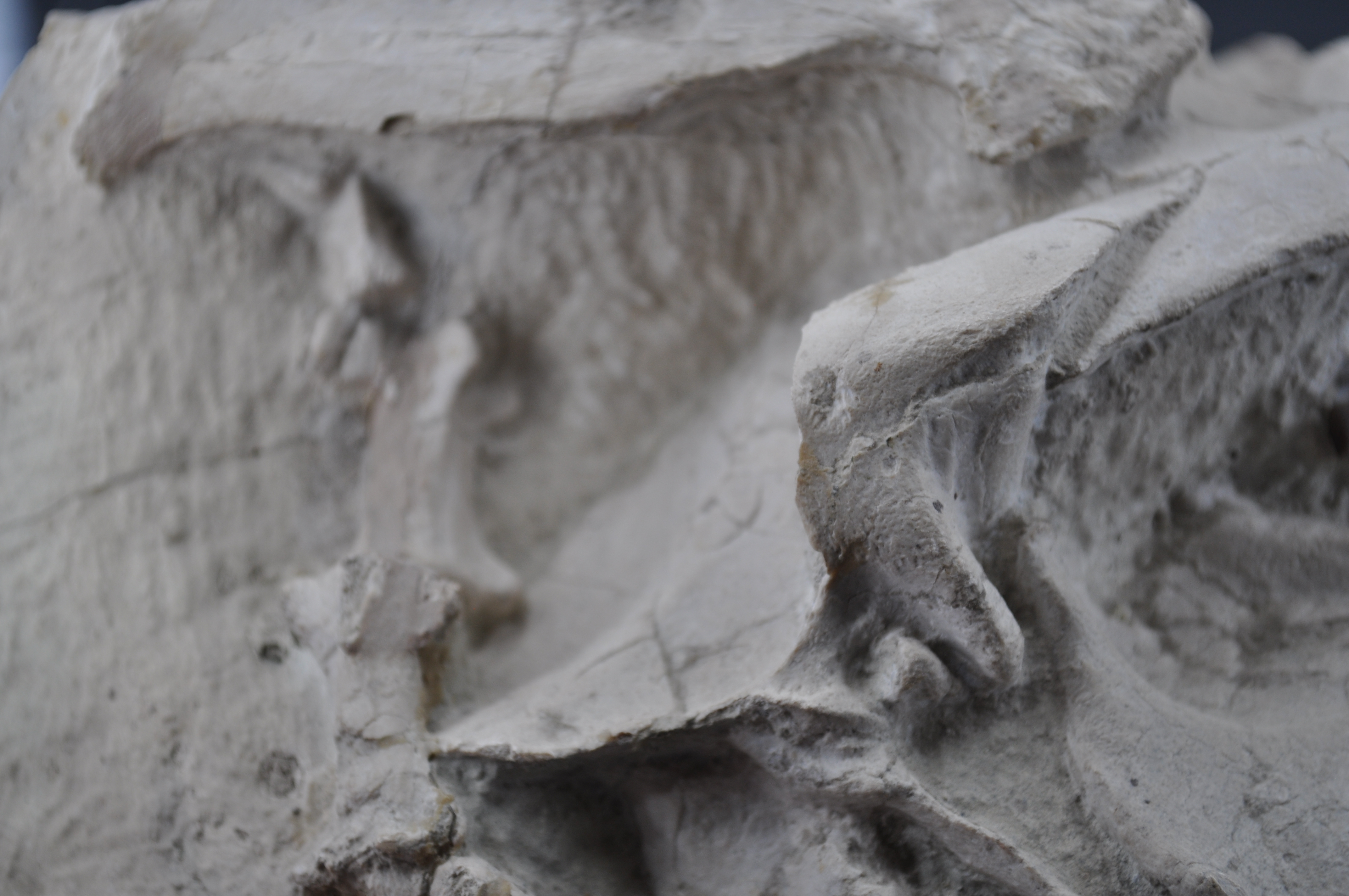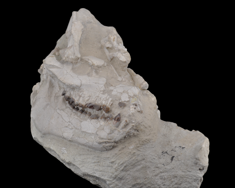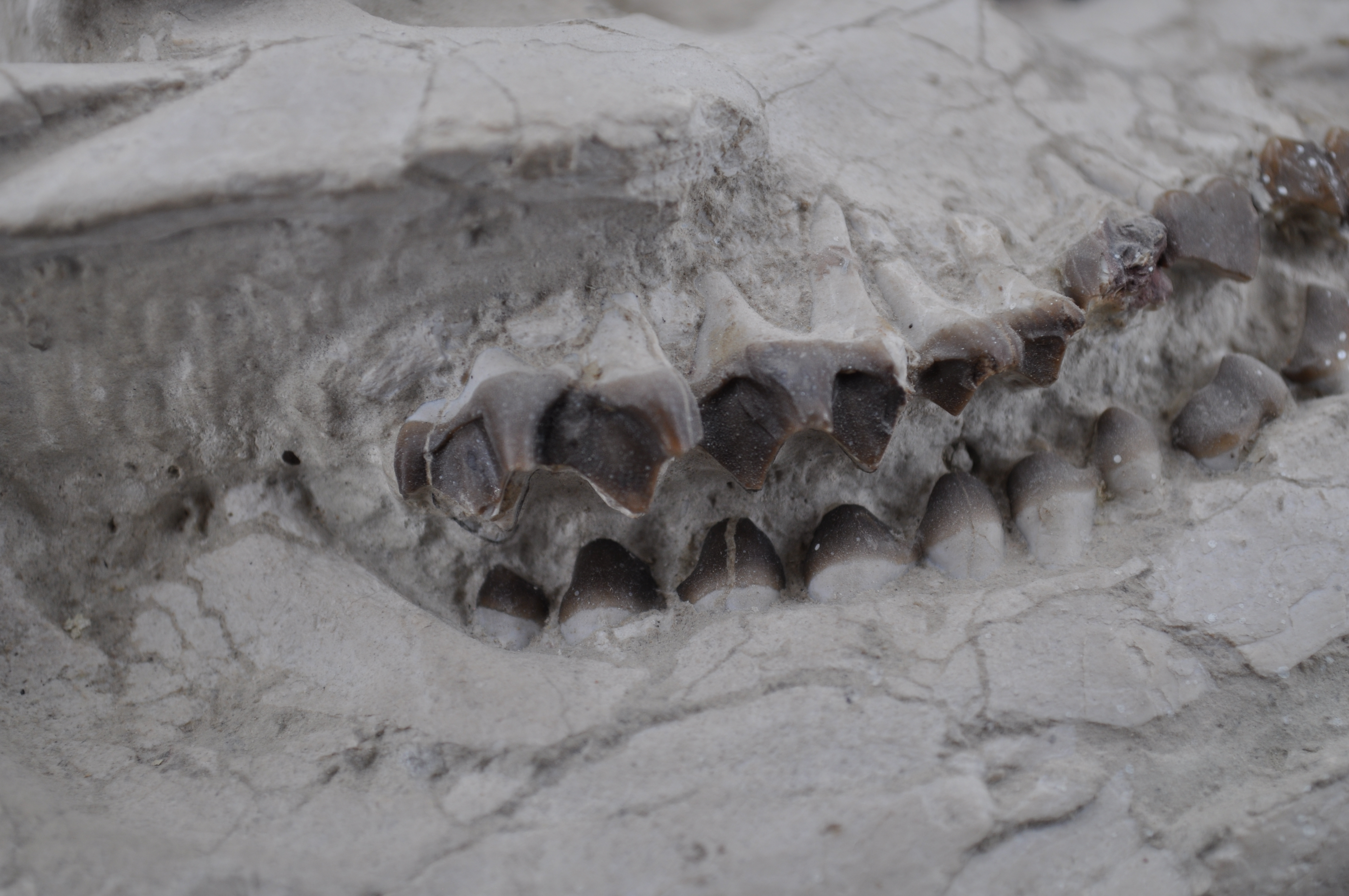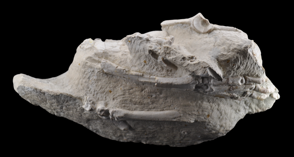 Crâne dans sa matrice de Merycoidodon culbertsoni. On y devine l’ensemble du crâne avec toutes les dents en place et l’atlas (C1) encore attachée, une patte avant et des éléments de patte arrière, un morceau du bassin coté gauche (attache du fémur) et quatres vertèbres caudales. Le tout est très bien conservé et forme un bloc harmonieux à 360°.