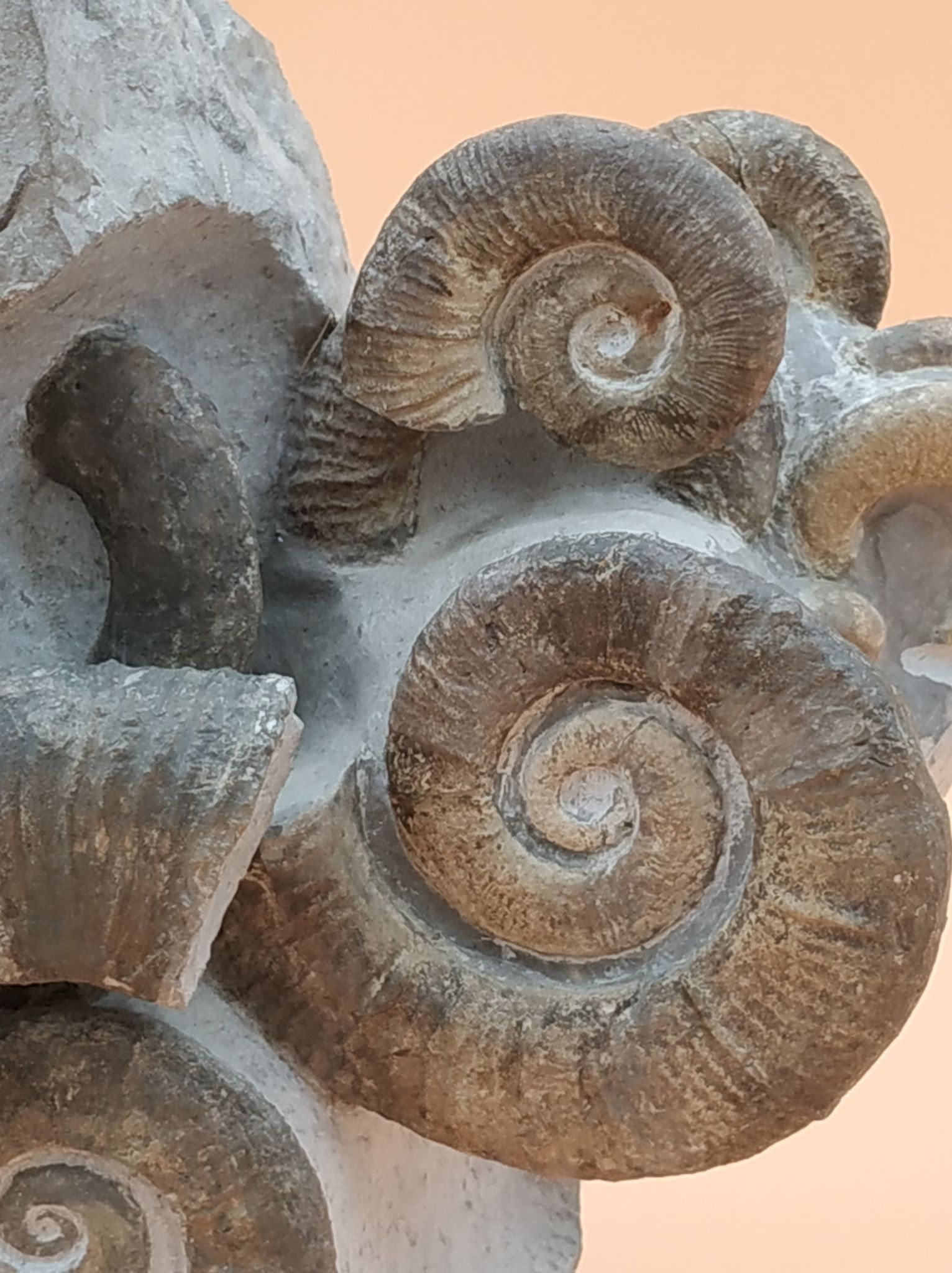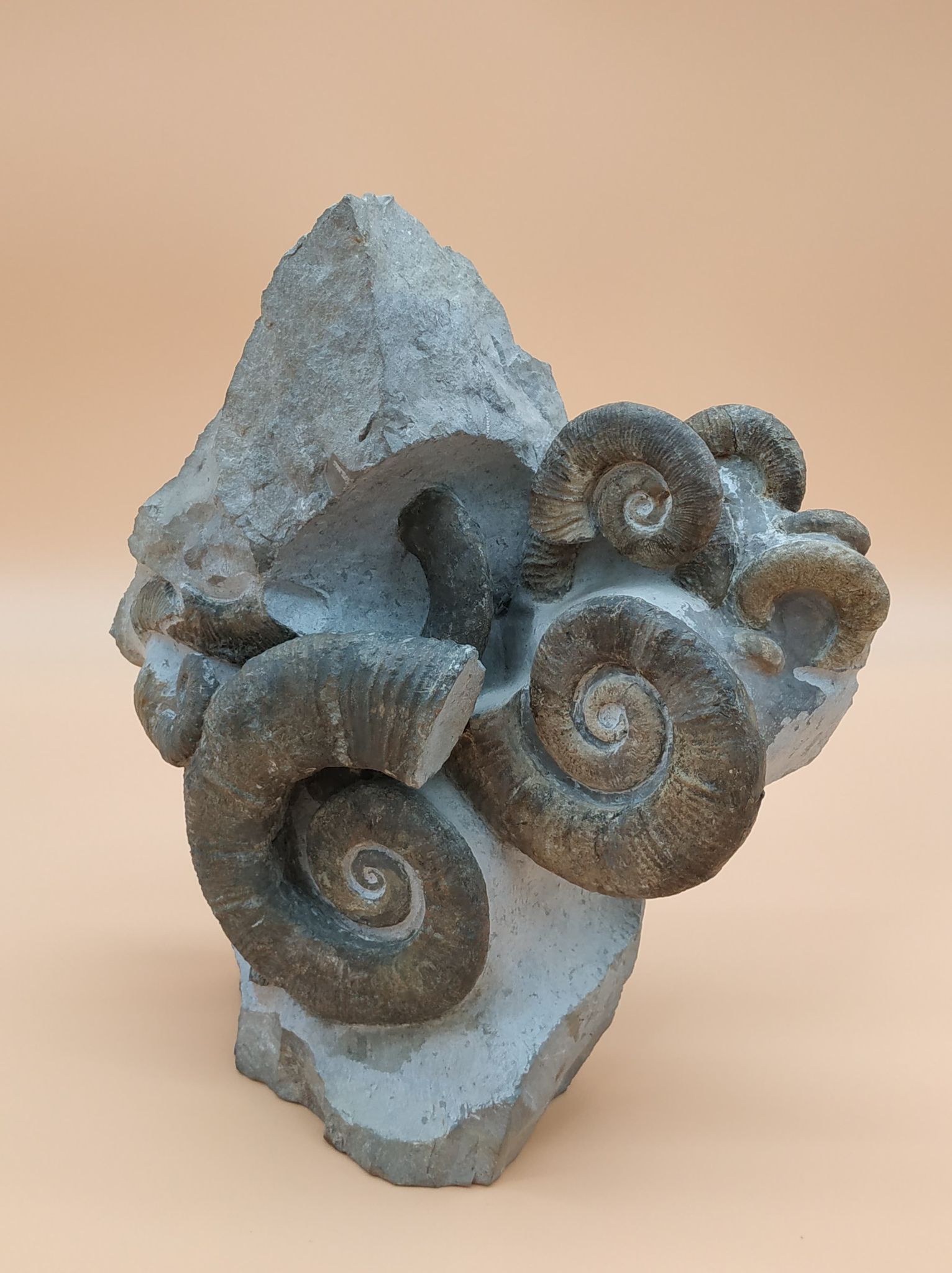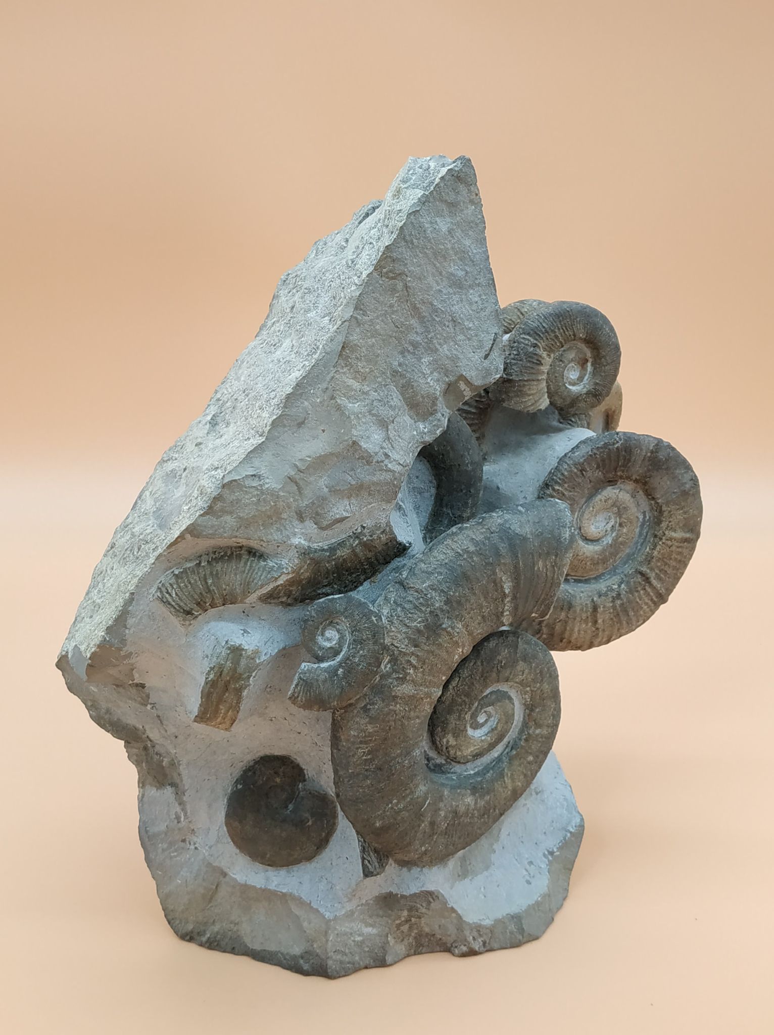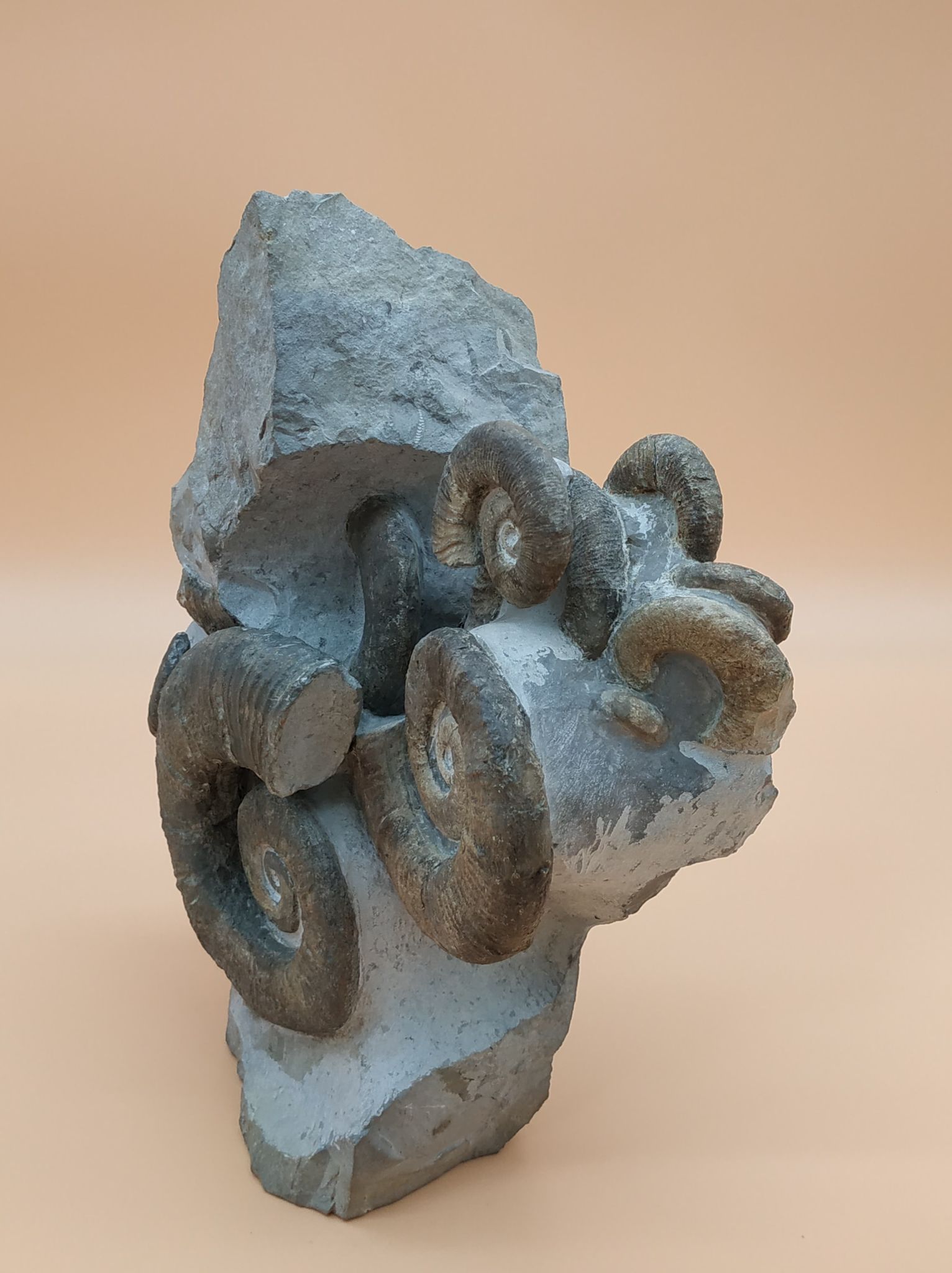 Bloc de plusieurs spécimens de Crioceras loryi qui illustre l’incroyable profusion de ces premières ammonites hétéromorphes dans ces couches.
