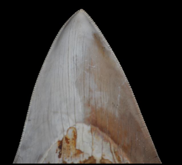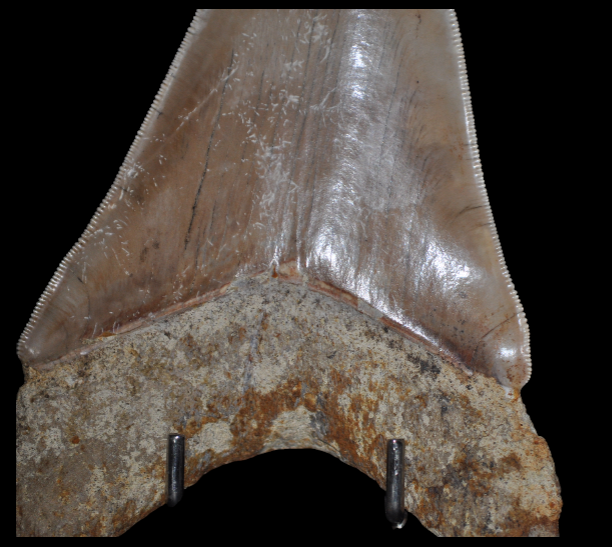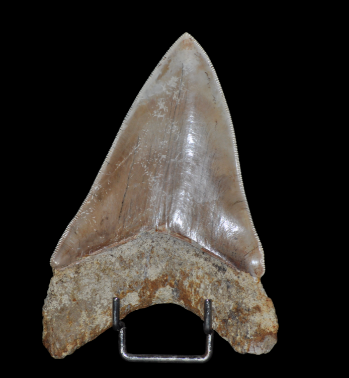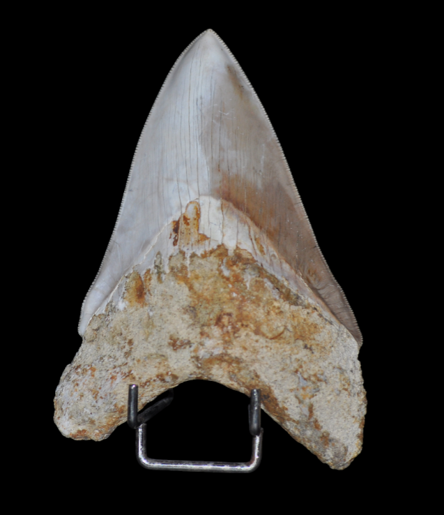 Dent d’excellente qualité d’Otodus (Carcharodon) megalodon, sans restauration. Elle a conservé tous les détails de sa crenelure et la racine est en très bon état. Sa taille et son bi-coloris naturel lui donne un charme et du caractère. Une pièce très belle pour embellir une collection.