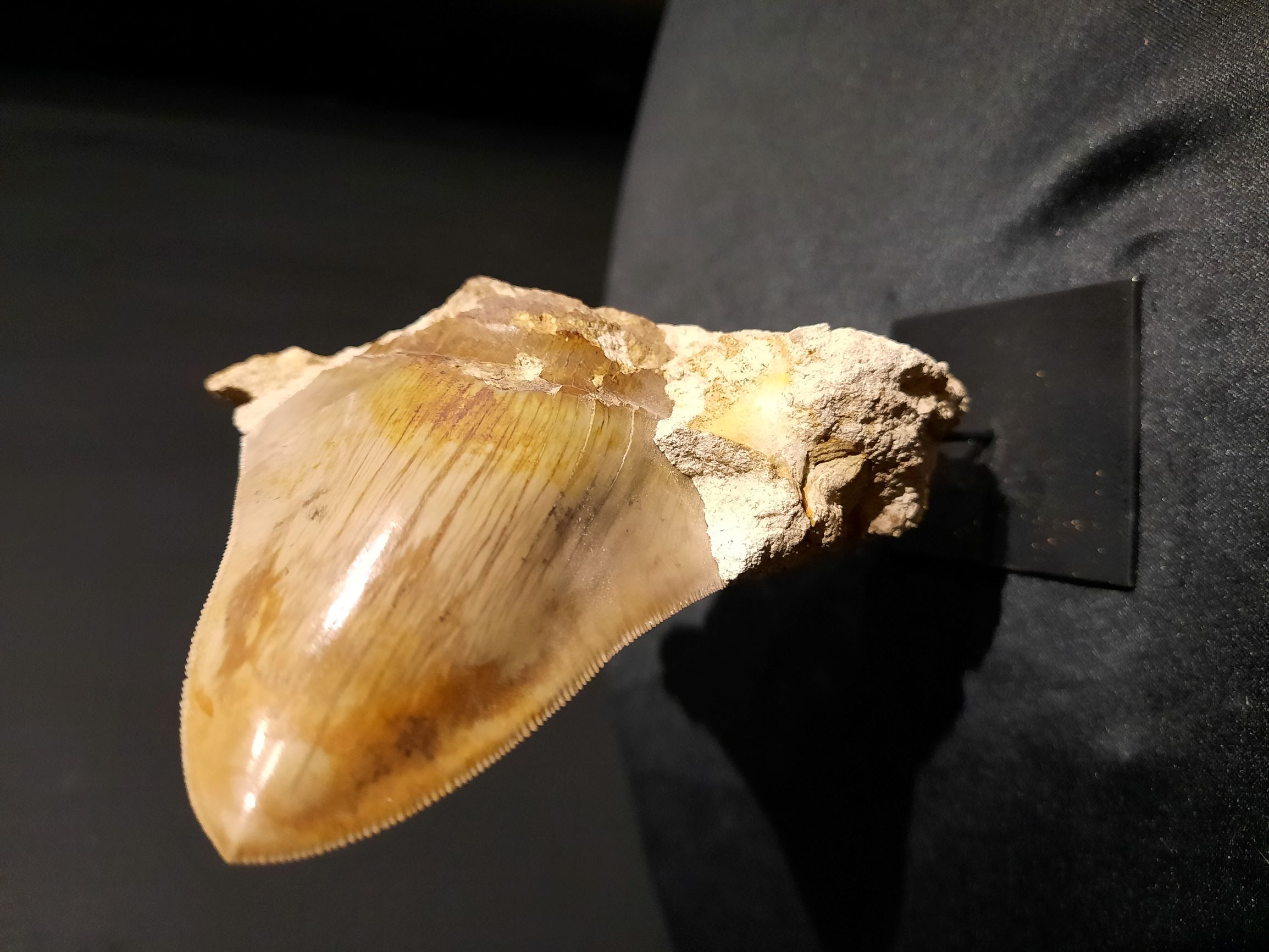 Dent d’Otodus (Carcharodon) megalodon sur gangue, vendue sur son socle.