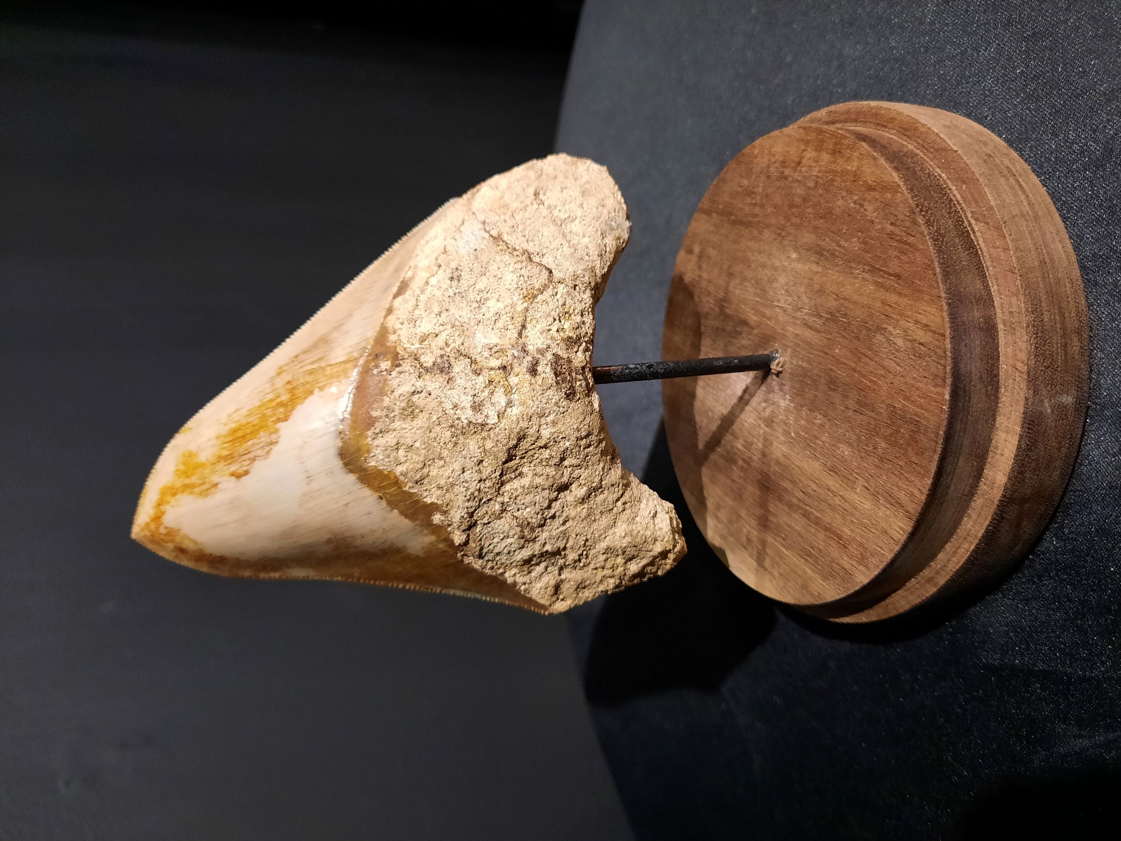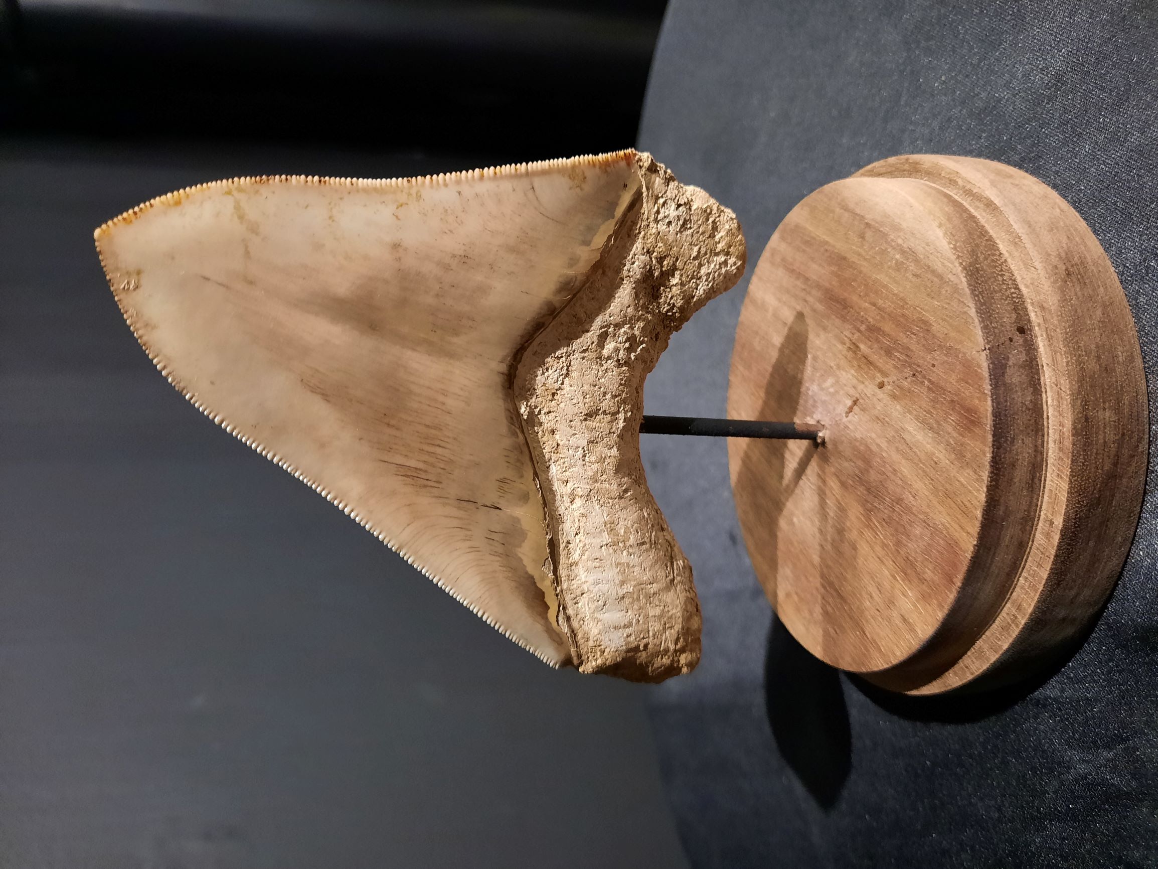 Dent d’Otodus (Carcharodon) megalodon, proposée sous une cloche soclée.