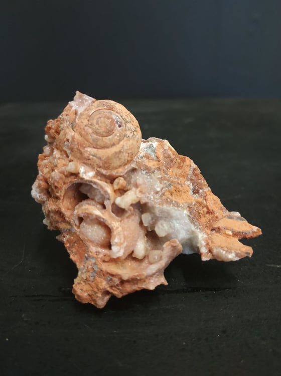 Ensemble de petis gasteropodes fossiles entre de petites géodes de calcite.