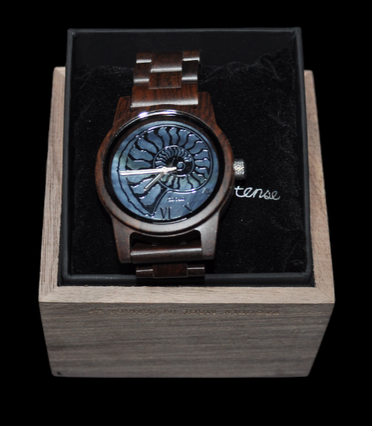 Cette montre Tense est produite en bois issus de production durable et d’acier inoxydable. Le motif de l’ammonite est souligné par le cadrant en nacre revelant des nuances de couleurs bleues claires.