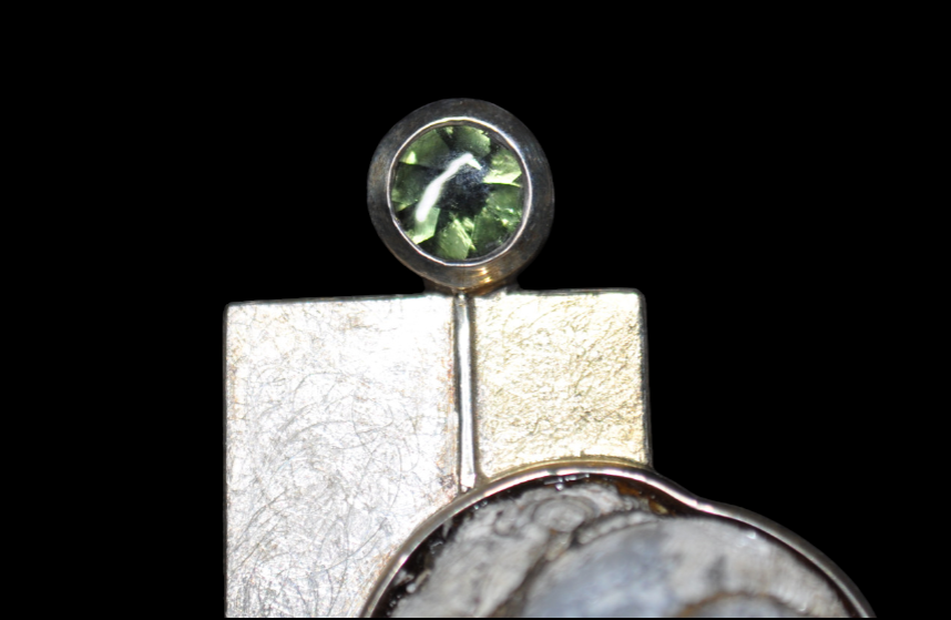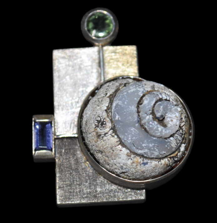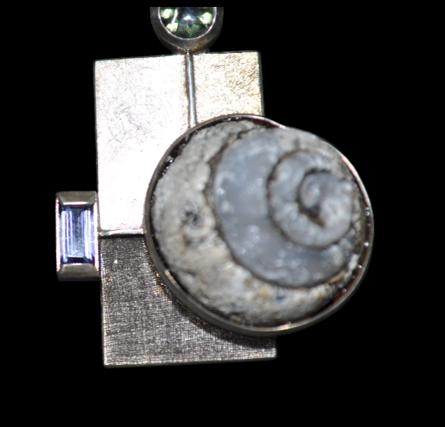 Quand à l’habillage du bijoux, on retrouve une moldavite (vert), une iolithe (bleu foncé) et un helix (escargot) fossile en lussatite également appelée « Opale d’Auvergne ».