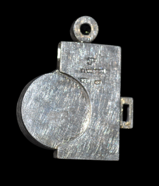 Pendentif confectionné avec de l’argent 925 millième (soit un alliage composé de 92,5 % d’argent) qui à la l’avantage de ne pas noircir avec le temps et qui correspond à la meilleure qualité qu’il est possible de trouver en joallerie. Une partie de la surface est patiné pour un rendu noirci volontaire. Enfin, un revêtement en or 18 carats (75%) est présent dans l’angle de droite.