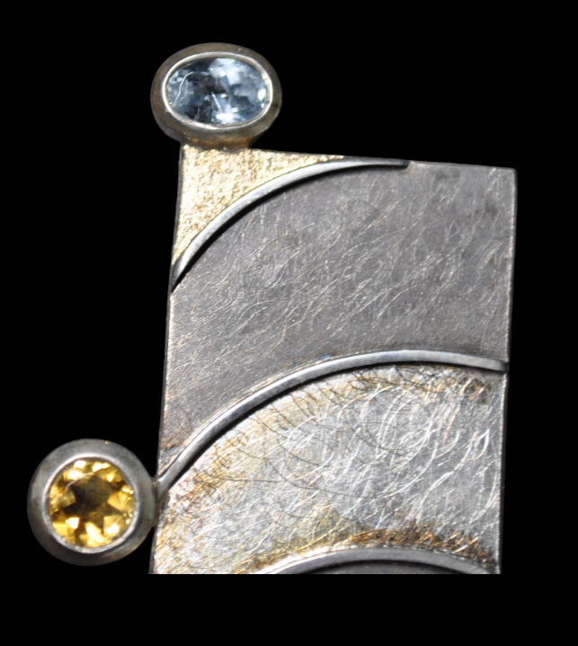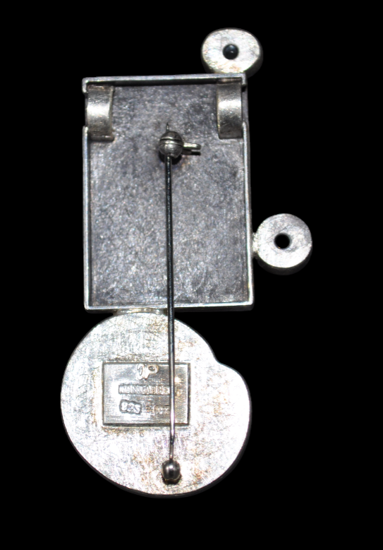 Pendentif qui fait également Broche confectionné avec de l’argent 925 millième (soit un alliage composé de 92,5 % d’argent) qui à la l’avantage de ne pas noircir avec le temps et qui correspond à la meilleure qualité qu’il est possible de trouver en joallerie. Une partie de la surface est patiné pour un rendu noirci volontaire. Enfin, un revêtement en or 18 carats (75%) est présent dans l’angle de gauche.