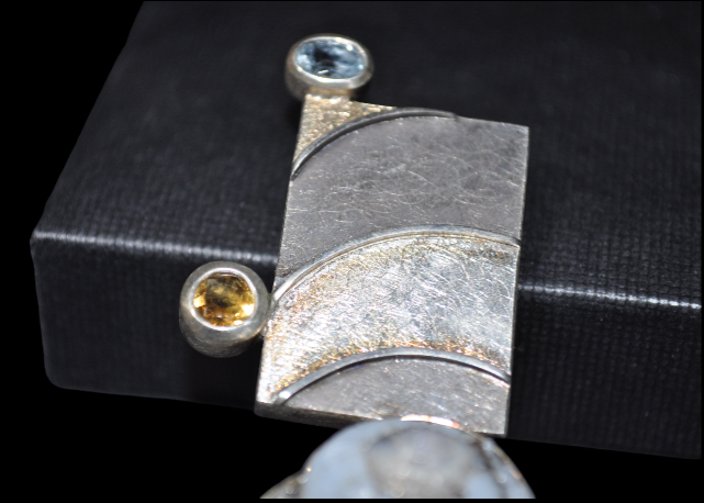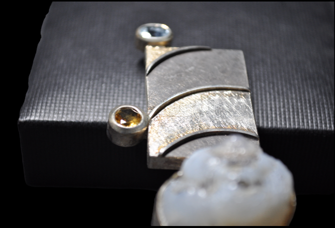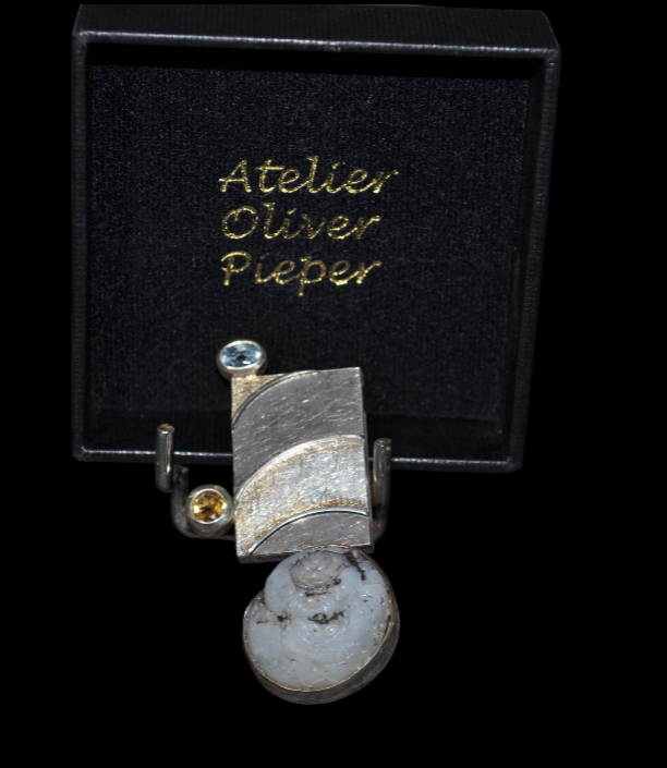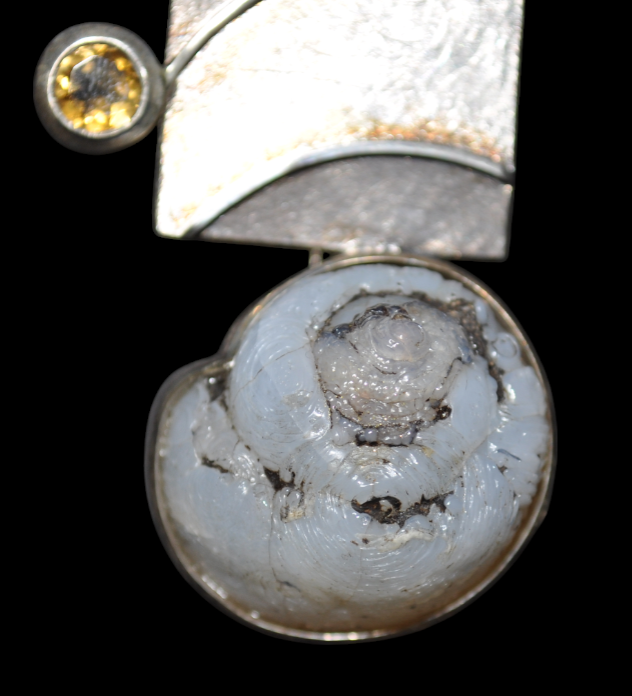 Quand à l’habillage du bijoux, on retrouve une aigue-marine (bleue claire), une citrine (dorée) et enfin un helix (escargot) fossile en lussatite également appelée « Opale d’Auvergne ».
