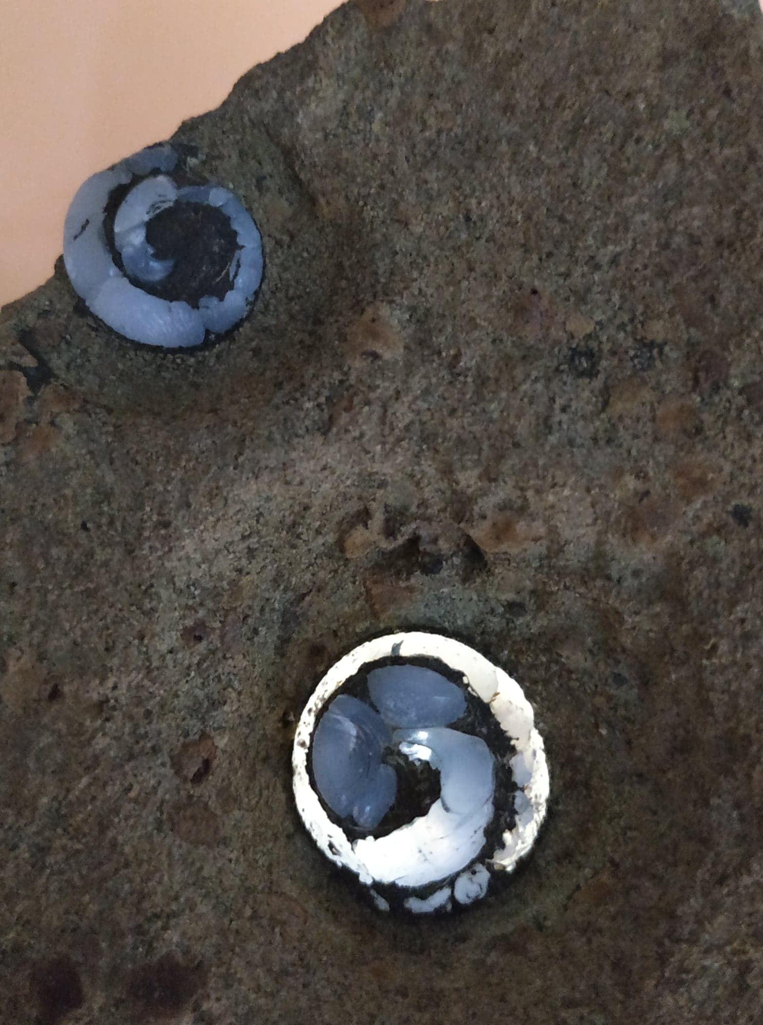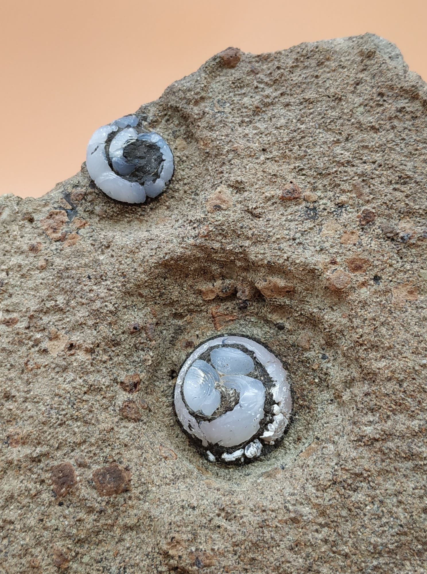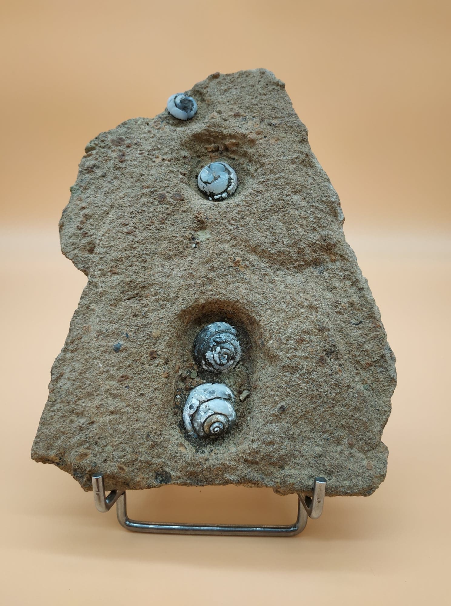 Très belle plaque avec 4 Helix ramondi en Lussatite aussi appelé « Opale d’Auvergne » (Opale). Tout est original, aucun collage n’a été effectué. La préparation soignée permet d’observer en transparence la couleur des Helix.