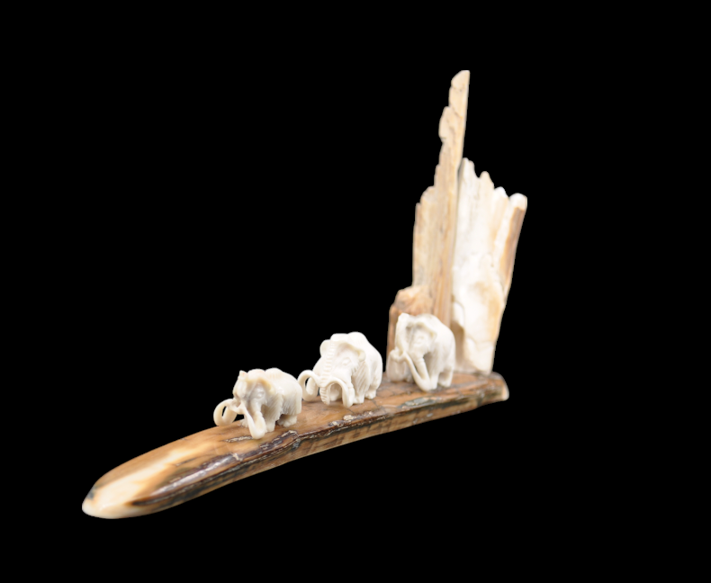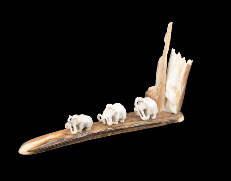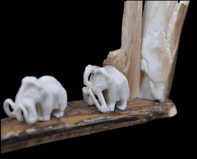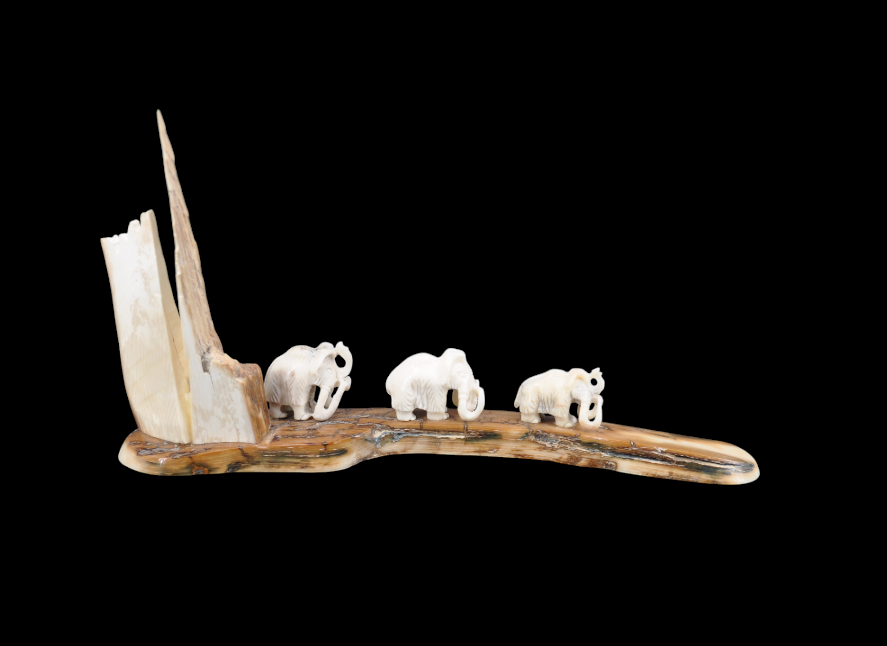 Magnifique sculture dans les détails de trois petis mammouths entièrement faite en défence de mammouth fossile (ivoire).