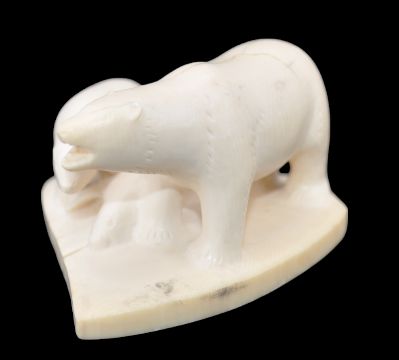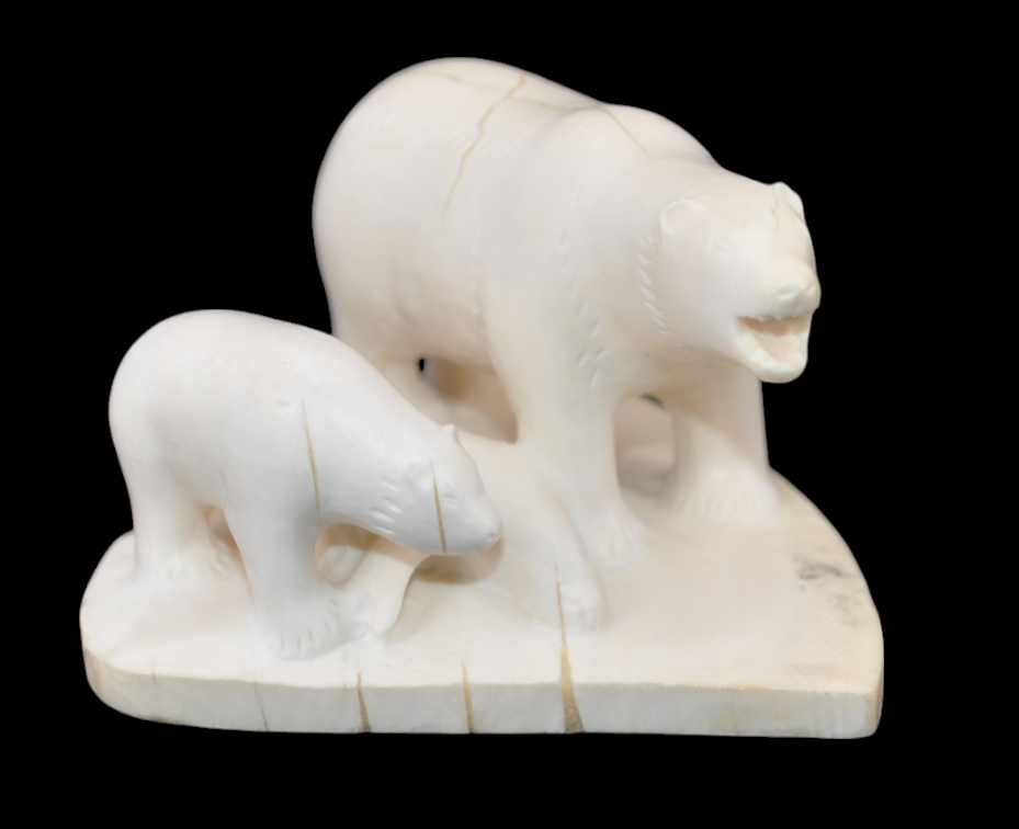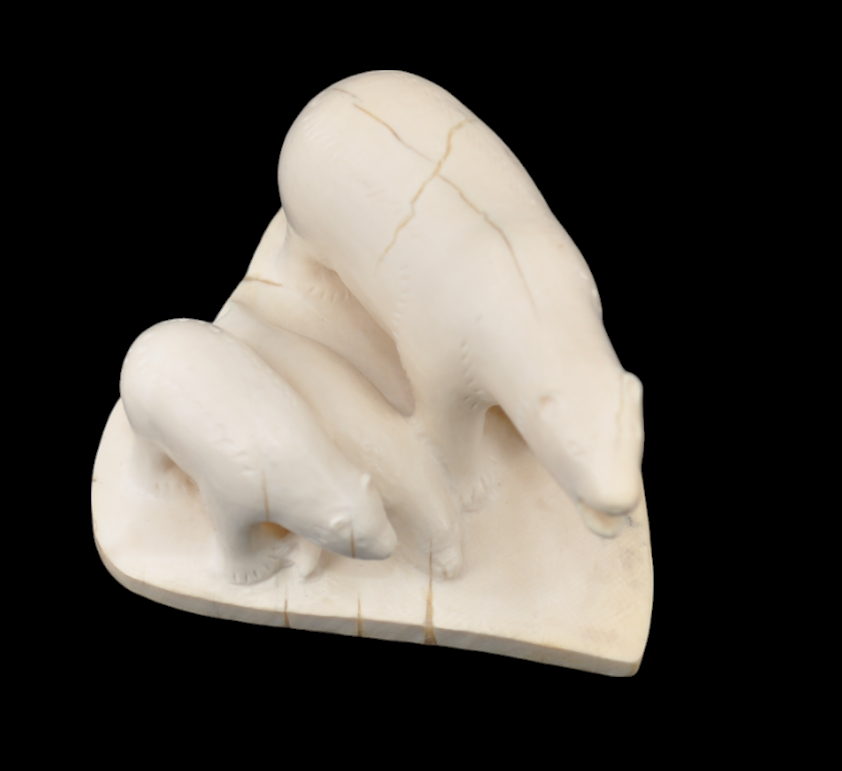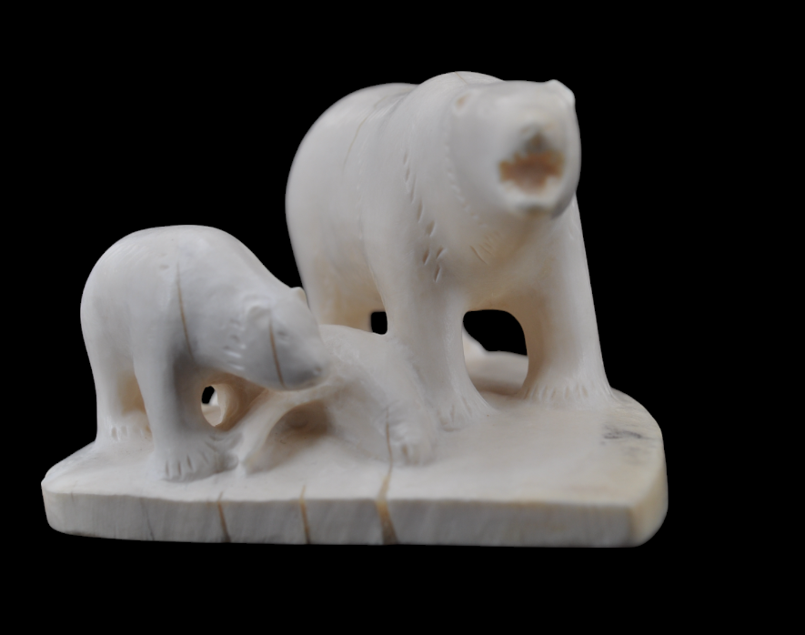 Sculture d’un ours polaire et de son ourson, accompagnés d’un phoque, et realisé en ivoire fossile de mammouth (défence). La pièce est en un seul morceau (zéro collage).