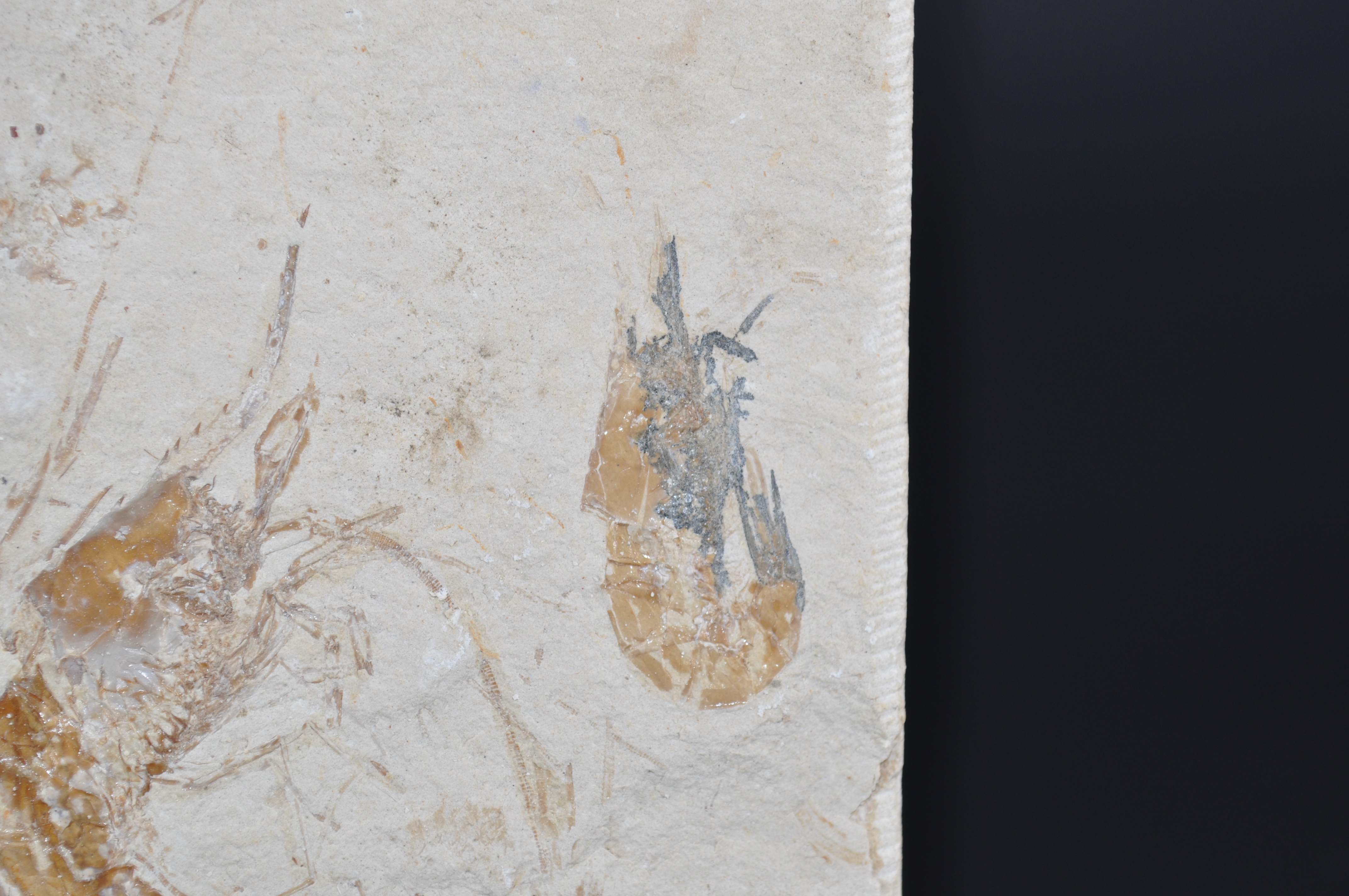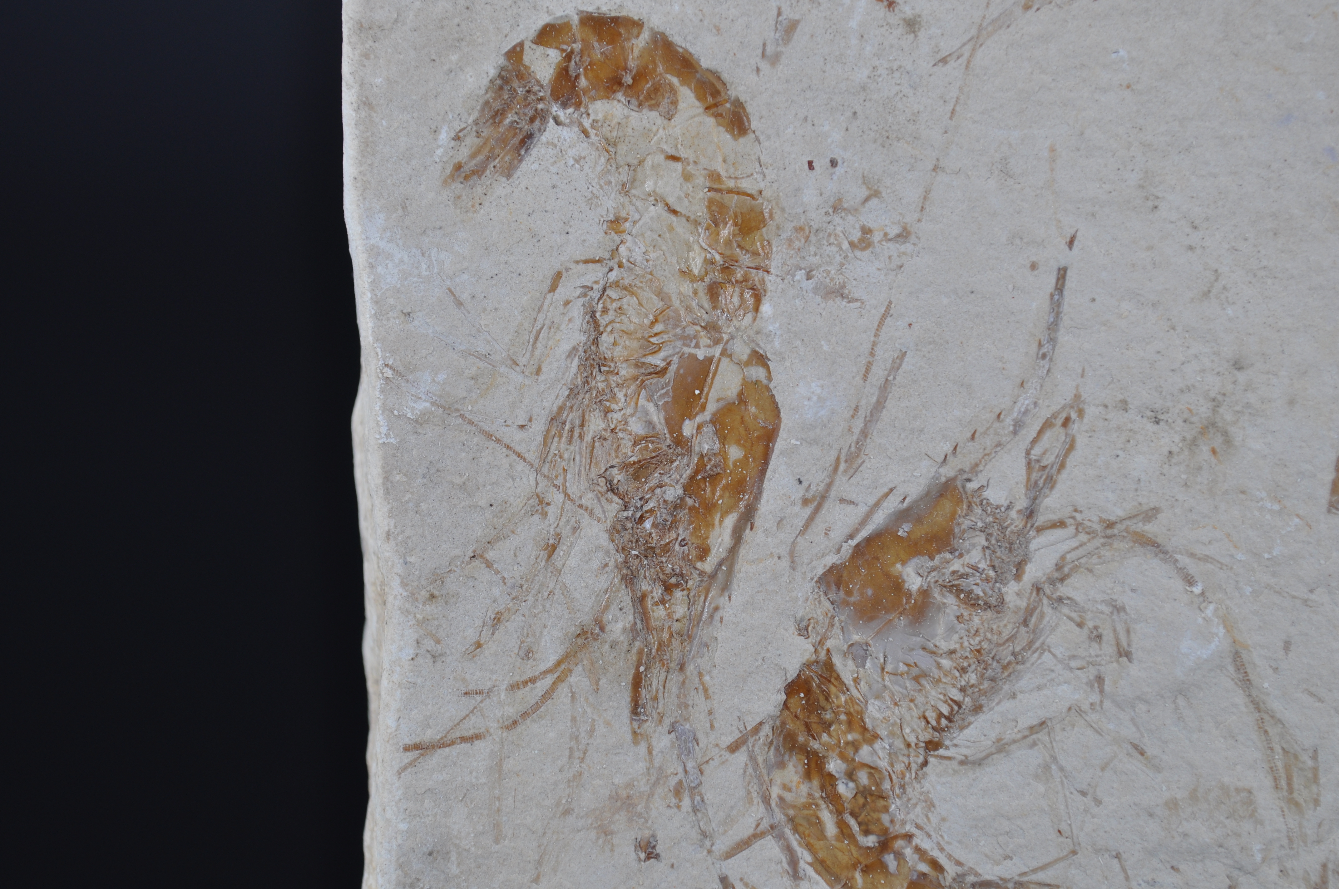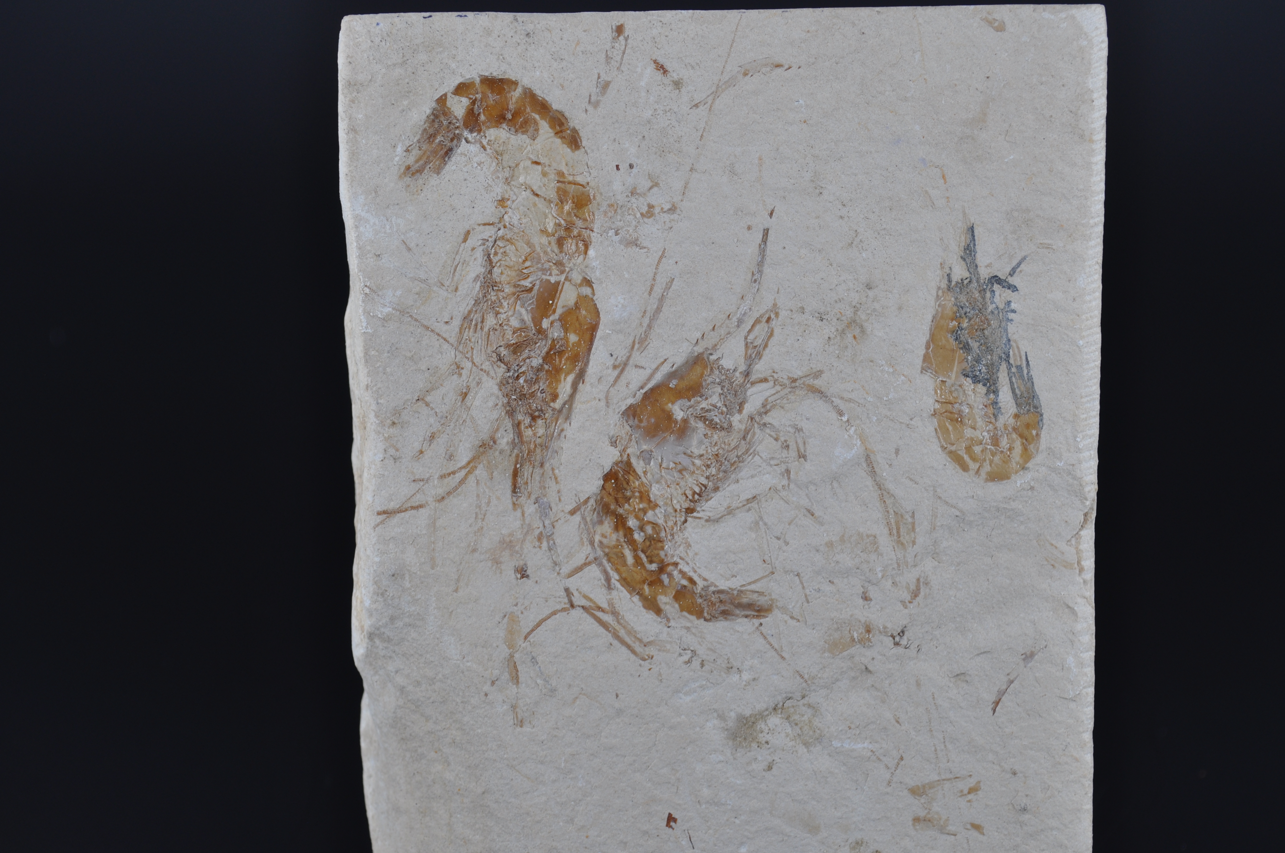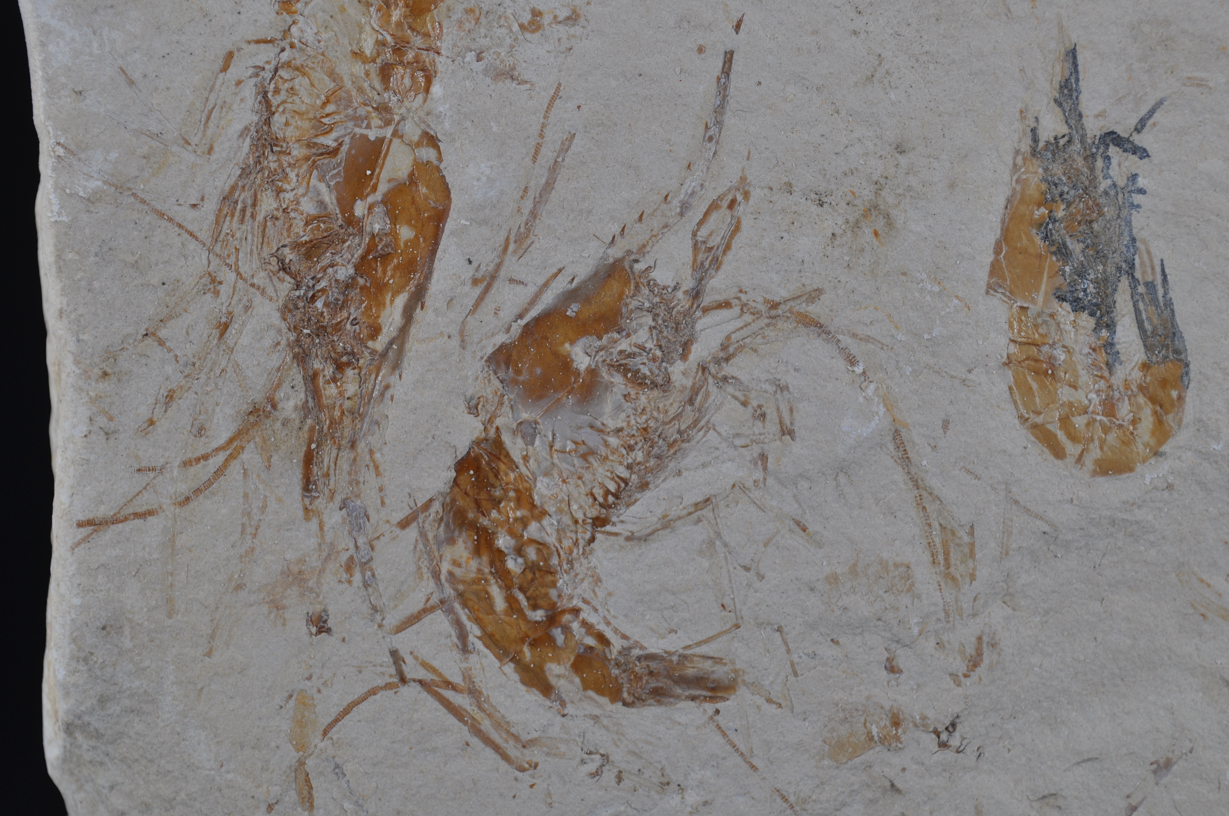 Très beau trio de crevettes fossiles du Liban Carpopanaeus callisrostris dans un très bon état de conservation. Elles ont préservé leur exosquelette et les parties les plus fines tels que les pattes et les antennes qui sont parfaitement distinguables.
